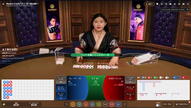 おすすめはルーベットとPragmaticPlayがコラボしたRoobet日本語バカラ。日本人ディーラーが着物風の衣装を着て、日本語でゲーム進行してくれます。プレイヤー・バンカーボーナスやペア等のサイドベットも充実していますよ。